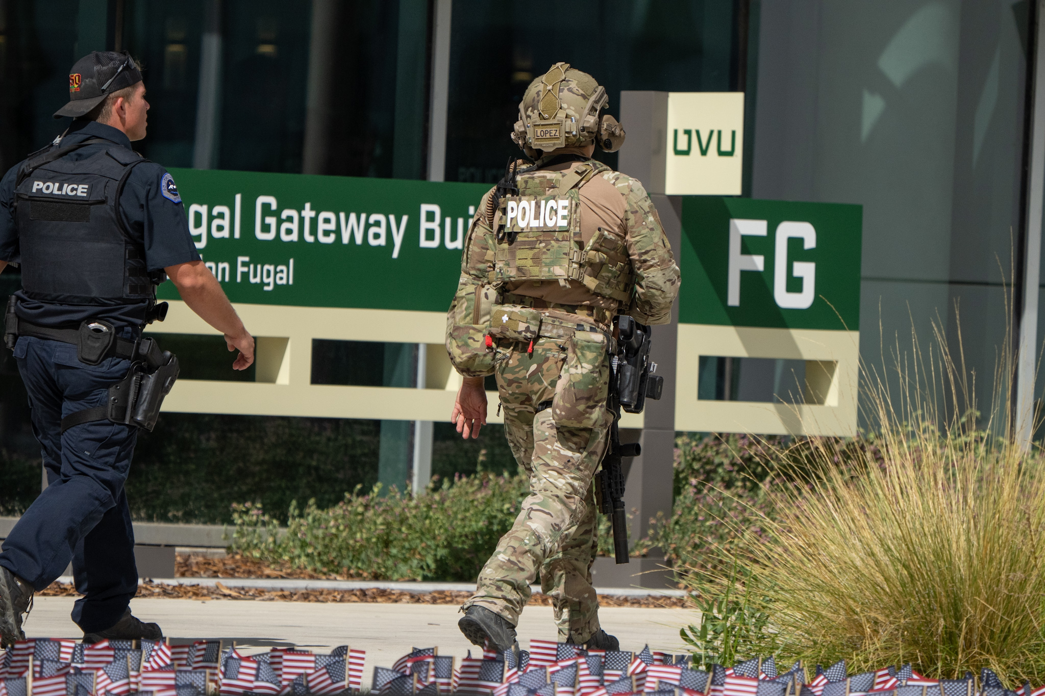 Law enforcement walks through the Utah Valley University campus after a shooter killed conservative activist Charlie Kirk as he was speaking at an outdoor event at the school on Wednesday, Sept. 10, 2025. (Photo by Spenser Heaps for Utah News Dispatch)