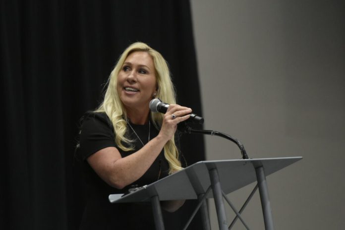 North Georgia Congresswoman Marjorie Taylor Greene speaks at a town hall in 2025. Ross Williams/Georgia Recorder