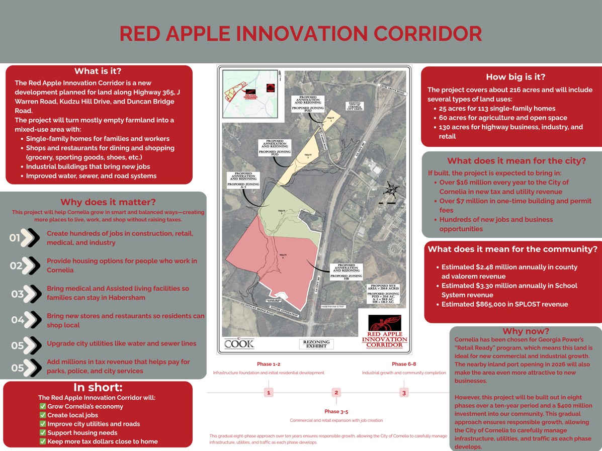 Cornelia has entered the final stretch of a major annexation decision that would reshape the Highway 365 corridor and create the Red Apple Innovation Corridor. The project covers 216.7 acres and would add housing, commercial development, industrial sites, and land for public safety facilities. It has also become the focal point of a wider debate about growth, authority, and regional planning in Habersham County.