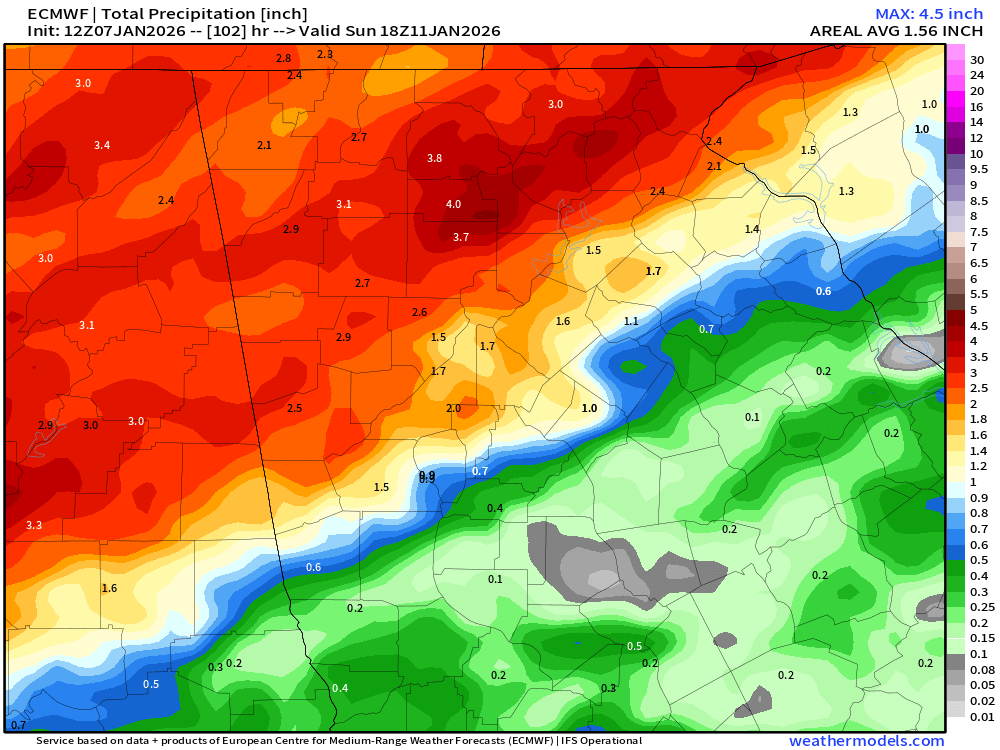 The heaviest rainfall totals are expected to fall roughly along and north of the I-20 to I-85 corridor in north/west Georgia. The further north and west you live, the more rain you will likely receive. The Euro model has bumped rain totals for the system up to 2-4″ across the area, with isolated higher amounts possible.