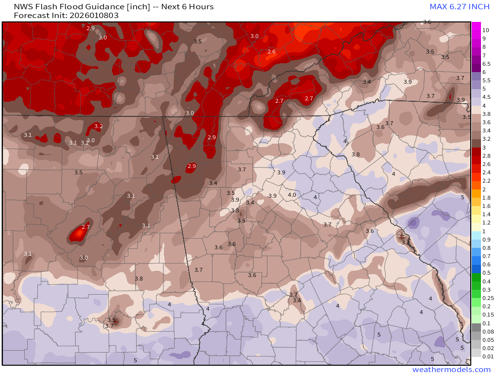 We’ll be keeping a close eye on Flash Flood Guidance into the weekend, which is the amount of rain in a period needed to result in flash flooding. The latest analysis is around 3.5-4″ in a 6-hour period for most of North Georgia but this number will change.