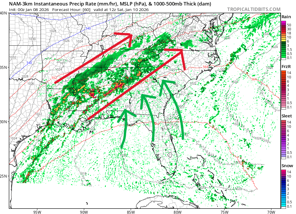 This front will be aided by well-above-average water temperatures in both the Gulf and Southeast Atlantic. Water temperatures are in the low/mid-70s out over open water, meaning lots of moisture will be available to transport north. A freeze frame at 7 a.m. Saturday reveals the setup for later in the day across North Georgia.