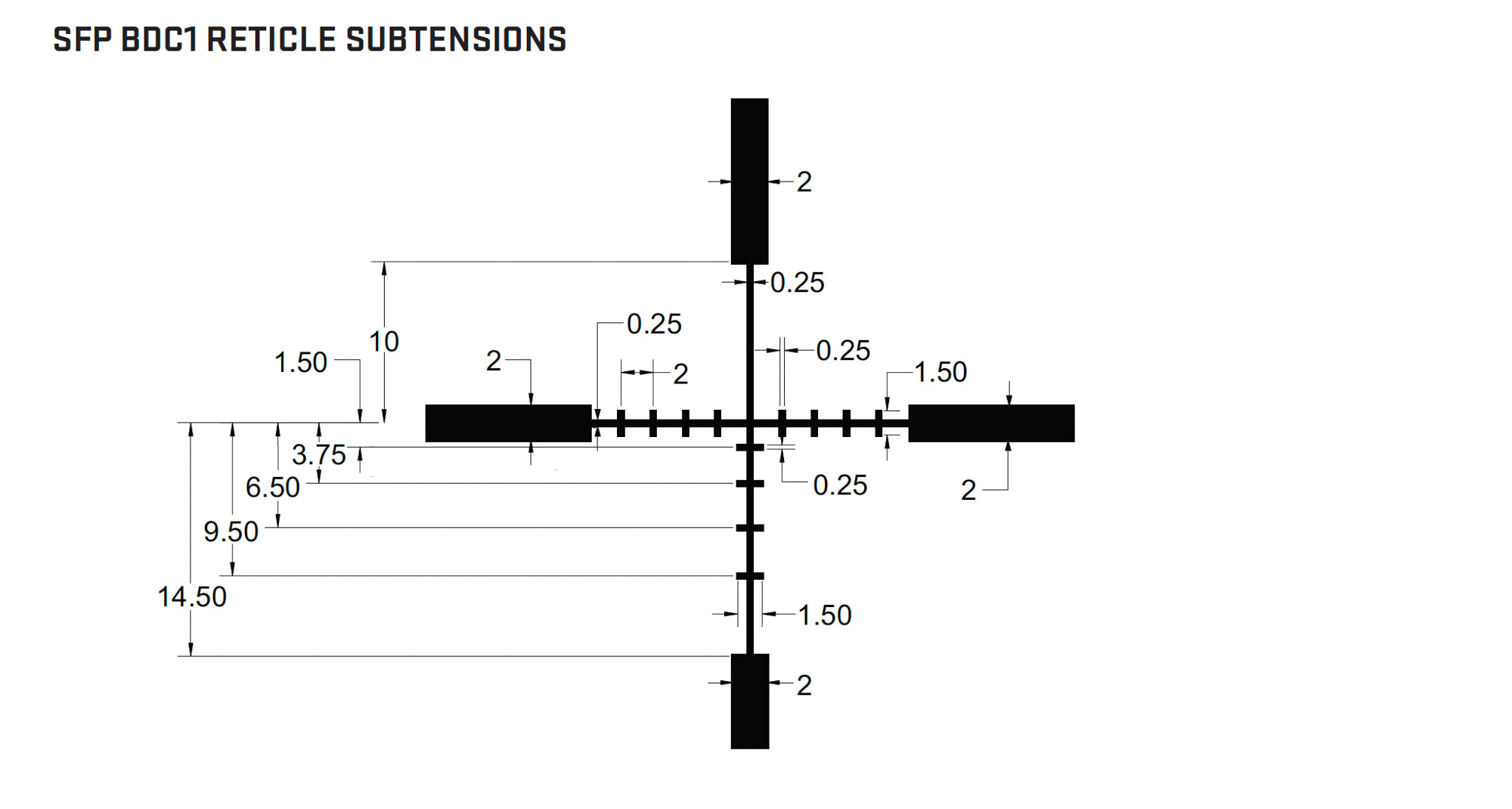 The marks down the vertical axis show drops from the center of crosshairs of 1.5 MOA, 3.75 MOA, 6.5 MOA, 9.5 MOA, and 14.5 MOA (the top of the duplex post) respectively. For my rifle, with its 100 yard zero, those roughly correspond to distances of 210, 300, 400, 500, and 630 yards. (The values I quoted in my video were slightly different due to the wind, temperature, and elevation that day.)