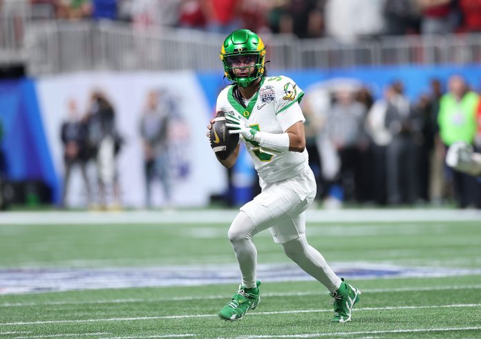 ATLANTA, GEORGIA – JANUARY 09: Dante Moore #5 of the Oregon Ducks looks to pass against the Indiana Hoosiers during the first quarter of the 2025 College Football Playoff Semifinal at the Chick-fil-A Peach Bowl at Mercedes-Benz Stadium on January 09, 2026 in Atlanta, Georgia. (Photo by Kevin C. Cox/Getty Images) | Getty Images