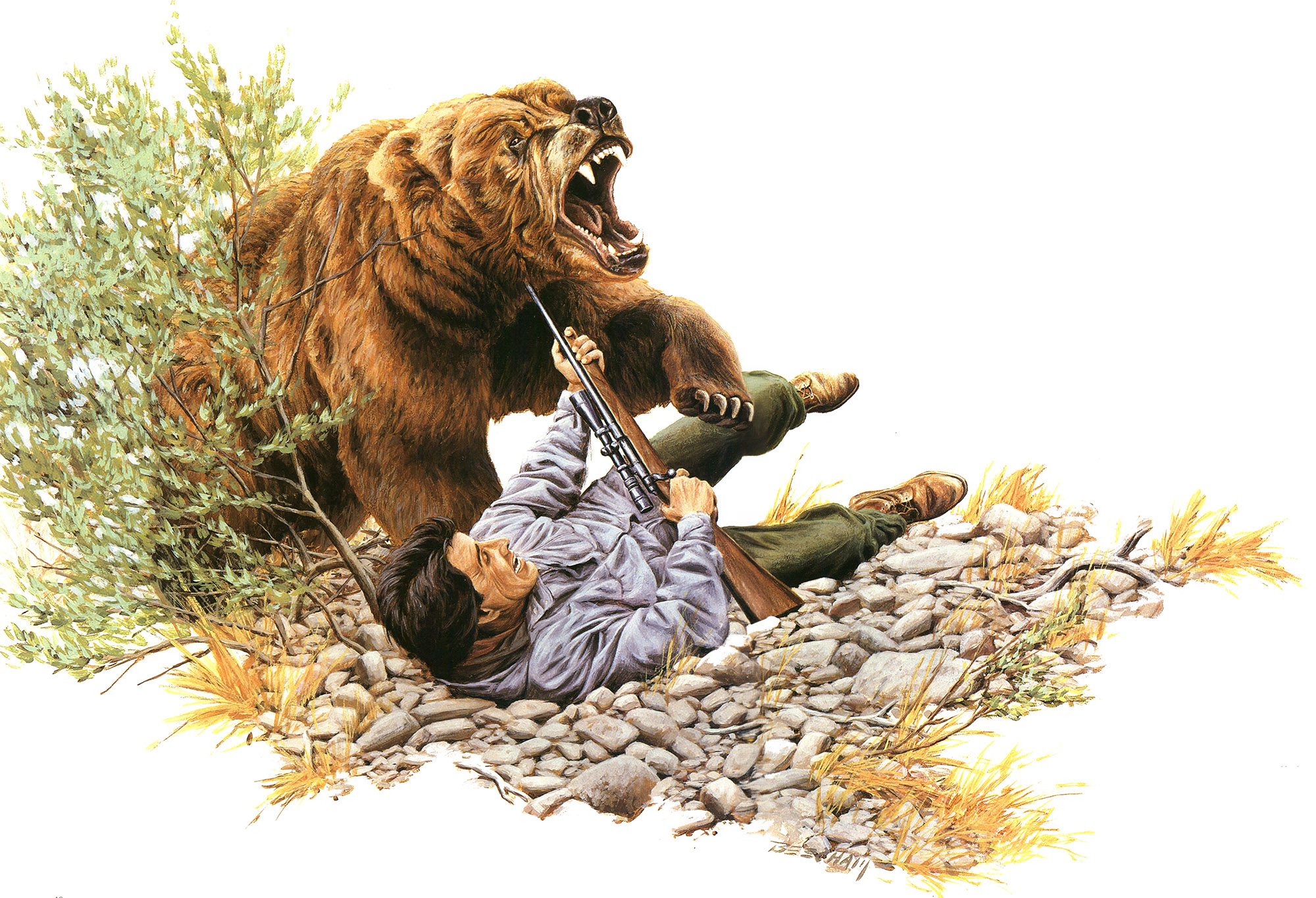 Duane stiffened against the impact and tried to shove the rifle muzzle into the bear’s mouth when she leaped. He missed. The sow hit the barrel with her chin, the force of her momentum knocking Duane on his back. But Duane’s grip on the rifle was so tight that the muzzle stayed jammed under the bear’s chin. The brown stood looking down at Duane, her head rolling from side to side against the gun’s muzzle as she tried to get her jaws off the barrel and at the man.