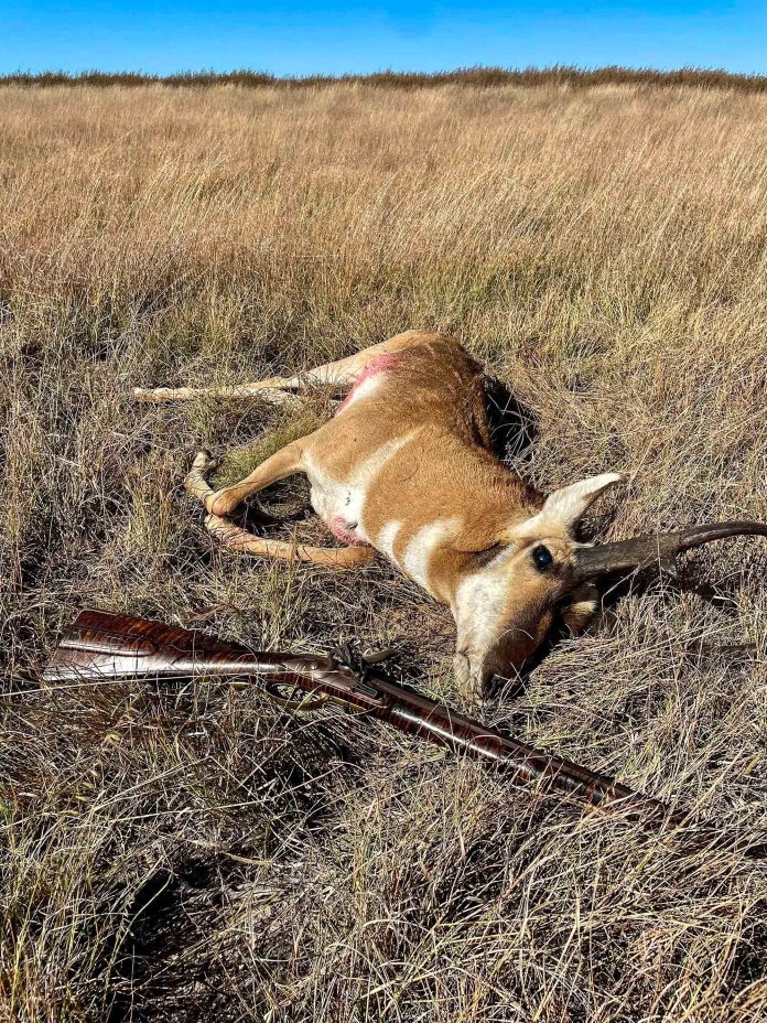 “I want to get all four big game Kansas species with my flintlock, and this pronghorn is my third. I’ve taken a good whitetail buck and an elk. All I need now is a mule deer buck and I’ll have a big game state slam with a flintlock.”