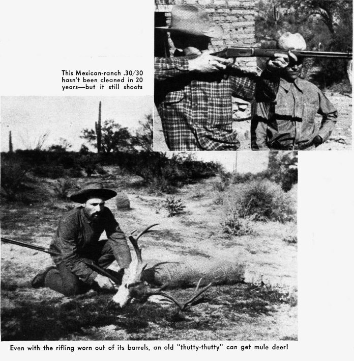 All in all, then, there are probably more than 2,000,000 rifles chambered for the .30/30 floating around North America. Most of them, if the relics I have seen are any indication, are still in use. They are shooting polar bears and caribou in the Arctic, moose in Canada, deer all over the United States and Mexico. In the Mexican revolutions, the .30/30 Winchester carbine was one of the principal military rifles in use. I have seen whole squads of soldados armed with that weapon. In the 1929 revolution I met an amiable gentleman who was in the United States to buy and smuggle rifles to his compadres south of the line. He was interested in just two calibers —— the .30/30 and the .30/06.