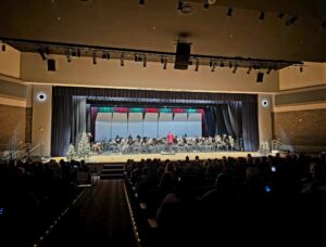 The Symphonic Band leads the first half of the performance. The Wind Ensemble follows. The ensemble includes upperclassmen who fill the stage with a larger sound and tight coordination. Between pieces, Weinstein offers remarks that give greater meaning to the selections. Before Sleigh Ride, he says, “It isn’t Christmas unless we hear Sleigh Ride.” The audience responds with recognition and a short wave of laughter. The whip crack of slapsticks and the beat that suggests the clatter of hooves carry the room through the familiar tune.