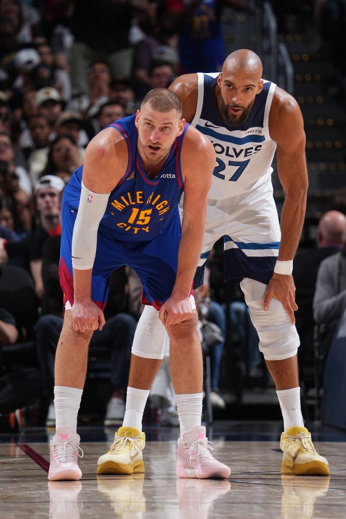 DENVER, CO – APRIL 20: Nikola Jokic #15 of the Denver Nuggets and Rudy Gobert #27 of the Minnesota Timberwolves look on during the game during Round One Game Two of the 2026 NBA Playoffs on April 20, 2026 at Ball Arena in Denver, Colorado. NOTE TO USER: User expressly acknowledges and agrees that, by downloading and/or using this Photograph, user is consenting to the terms and conditions of the Getty Images License Agreement. Mandatory Copyright Notice: Copyright 2026 NBAE (Photo by Bart Young/NBAE via Getty Images) | NBAE via Getty Images