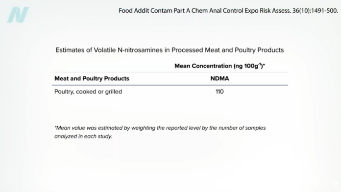 Now, raw poultry doesn’t have any NDMA; it comes from the cooking process. In fact, the dry-heat cooking of meat, like broiling or grilling, even creates airborne NDMA, releasing this very potent carcinogenic compound into the air. So, even if you’re getting a salad at a charcoal grill restaurant, just being indoors where meat is being grilled could be a significant cancer risk.