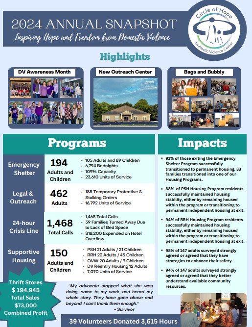 In Georgia, more than 250,000 domestic violence incidents were reported between 2016 and 2020, and 770 people lost their lives to family violence. Shelters like Circle of Hope save lives by giving survivors a place to go when returning home would mean danger. They ease the burden on police, provide refuge at the most volatile moment, and help rebuild families in safety instead of crisis.