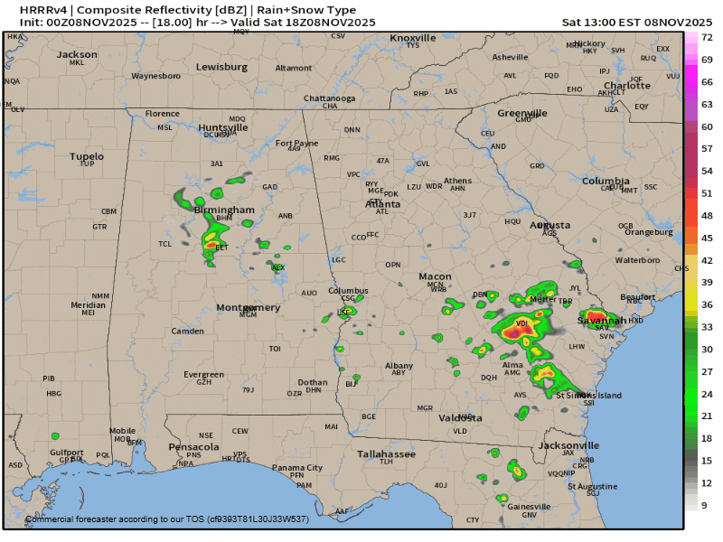The cold weather is almost here. First up, though, we have another chance of storms across the region. High resolution models have come into good agreement on isolated to scattered storms developing across North Georgia ahead of the approaching front. These storms are mostly likely from 3PM onward Saturday afternoon and will be moving quickly from southwest to northeast. I can’t rule out an isolated strong or possibly severe storm on Saturday afternoon/evening with hail and gusty winds being the main threats.