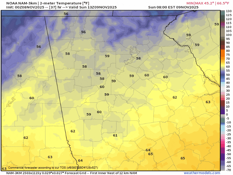 Additional showers are likely along the cold front Sunday morning. High temperatures on Sunday will be radically different depending on where you live. The highs to the northwest of the high elevations (Clayton, Hiawassee, Blairsville, Blue Ridge, Suches, etc) will likely occur on Sunday morning. Temperatures will begin to fall in these locations around 12-1PM and drop into the 30s by 4 or 5PM. To the southeast of the higher elevations (Clarkesville, Cleveland, Dahlonega, Dawsonville, etc) the mountains will briefly slow down the approaching cold air. Highs will reach into the low/mid-60s by the afternoon, but temperatures even here will begin to plummet from 3/4PM onward. Overnight lows will drop below freezing region-wide.