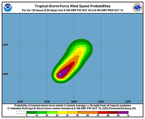Weather Subtropical Storm Karen Graphics By a2zreale - October 10, 2025 0 6 This post was originally published on this site 5-Day Uncertainty Track last updated Fri, 10 Oct 2025 08:51:37 GMT Wind Speed Probabilities last updated Fri, 10 Oct 2025 09:27:48 GMT