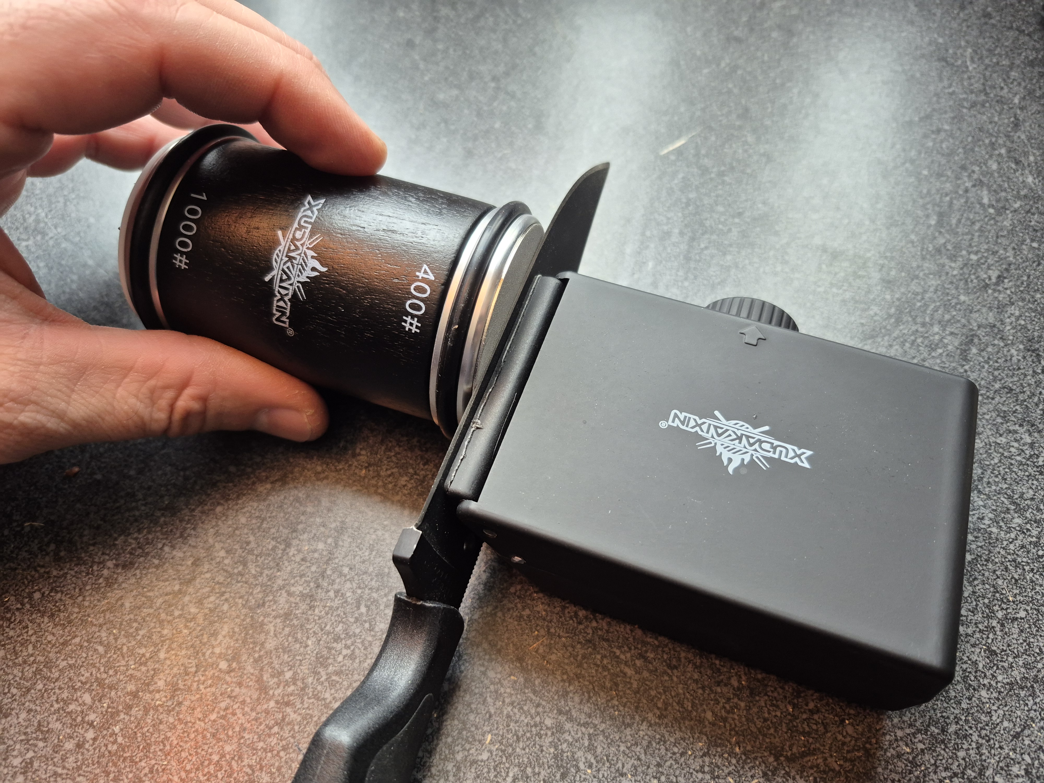 The Meinesqis rolling sharpener is a bargain basement deal for any type of sharpener, and it’s way better than a pull through style, which is what most people buy at this price. With a little patience, this will give you a far superior edge over carbide bit pull through “sharpeners”. The 400 is rough enough to re-profile and the 1000 gives you a decent finish. If you have a strop at home, you could end up with a shaving sharp edge if you take your time with the 1000 and the strop. The diamond coating doesn’t hold up well for higher end, high-hardness steels, but for average kitchen knives, and budget friendly pocket knives, these discs will do well and should last a while, especially with the included replacements. Even with the slight wobble in the discs, I was able to get pretty good results, especially on larger kitchen knives. The magnets are good, but smaller knives that are suspended above the work surface should be watched carefully and you should use less pressure to keep them from shifting. Otherwise, the Meinesqis is a steal of a sharpener at a paltry 12 bucks.