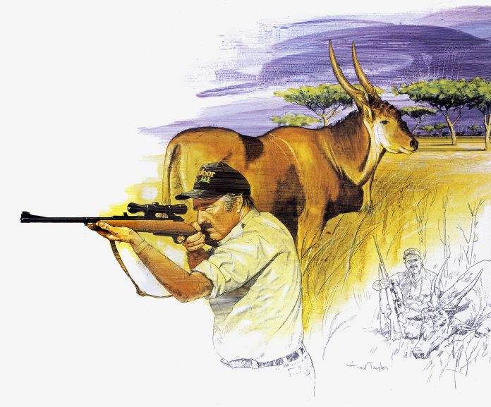 Now it was easy — too damned easy. With the animal only about 50 yards away and a tree to steady my aim, there was no way I could miss. Pinching the ri­fle’s safety between my fingers and mov­ing it slowly so there wouldn’t be a metallic click, 20 years of eland hunting raced before my eyes. “By God,” I said to myself, “I’ve earned an easy shot.”