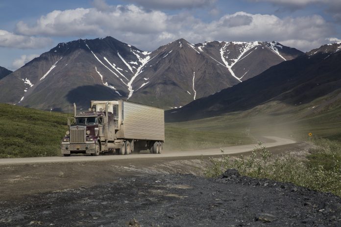 A semi kicks up dust along the Dalton Highway. Studies show “fugitive dust” from such roads in Alaska pollutes the tundra, and heavy traffic disrupts caribou migrations. Photo by Bob Wick / BLM