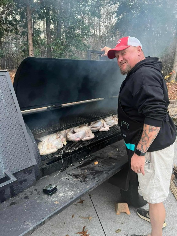 Eric Holbrooks, the “Turkey Man of Clarkesville,” pauses beside the two smokers that will cook the 35 birds served at this year’s Clarkesville Community Thanksgiving. (Photo: Clarksville Community Thanksgiving)